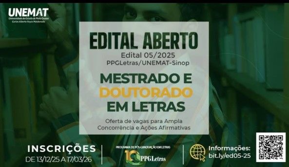 O Programa de Pós-Graduação em Letras da Universidade do Estado de Mato, Câmpus Universitário de Sinop – PPGLetras/UNEMAT comunica a comunidade acadêmica que se encontram abertas as inscrições para ingresso de discentes regulares nos cursos de mestrado e doutorado em Letras.