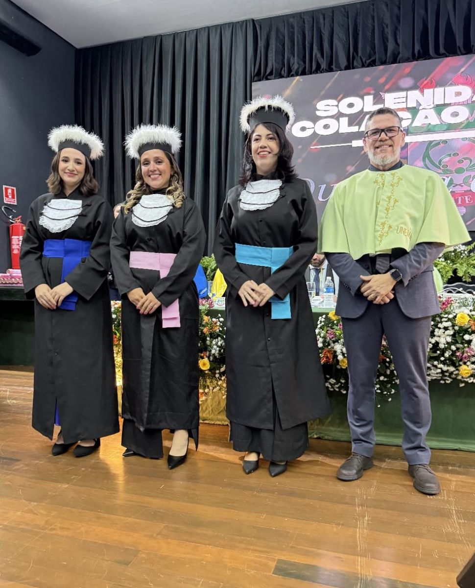 Novas bacharelas em Administração (Jéssica Breier Fiametti), Ciências Contábeis (Angélica Cristina Rodrigues de Moraes) e Ciências Econômicas (Jerssie Rodrigues de Sousa) após outorga de grau pelo Pró-Reitor Everton Ricardo do Nascimento